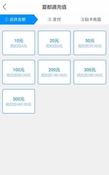 1. 公交卡充值:用户可以在首页点击“夏都通充值”,选择充值金额后进行支付,再根据提示将夏都通卡贴到手机背面即可完成充值。