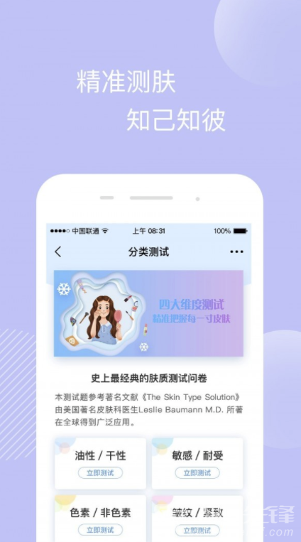 2. 肤质测试:采用美国皮肤科专家认可的皮肤分类方法,准确识别用户的肤质类型,为个性化护肤提供科学依据。