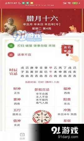 2. 融入黄历查询功能,包括出门宜忌、胎神、十二神等详细信息。