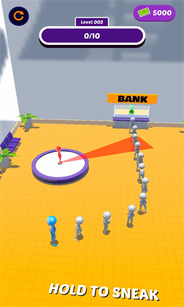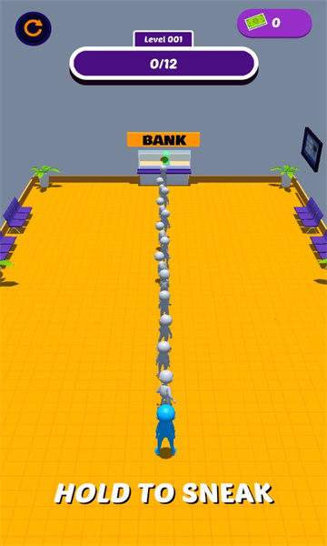 sneak the line v0.1安卓版是一款极具趣味性的休闲益智游戏。玩家将在模拟的银行大厅环境中,通过巧妙地避开守卫的视线,成功插队办理业务,体验一场充满挑战和乐趣的闯关冒险。游戏画面采用3dq版卡通风格,简约而富有创意,为玩家带来轻松愉快的视觉体验。