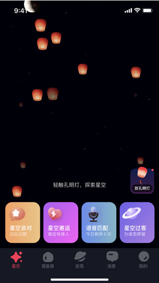 1. 星空匹配模式:支持孔明灯漂流瓶交友、语音随机匹配,快速结识真实用户,并提供即时语音连线。