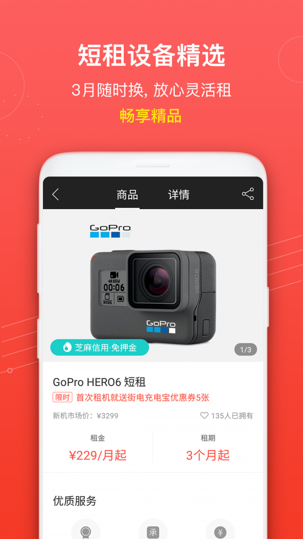 2. 信用租赁便捷:与芝麻信用达成长期战略合作,通过用户的信用分提供全免押金或部分免押金的租赁服务。