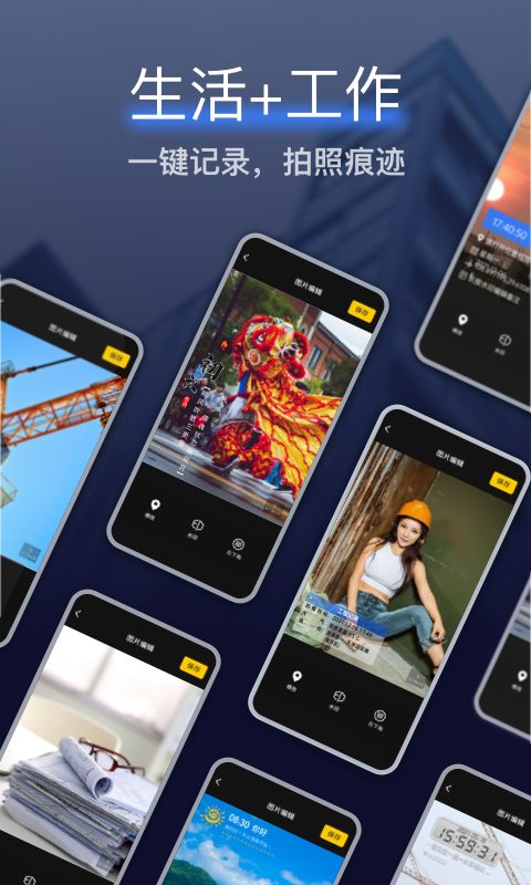 2. 海量水印模板:应用内置海量水印模板,涵盖施工信息、时间地点、会议记录、宝宝成长记录等多种场景,方便用户一键使用。