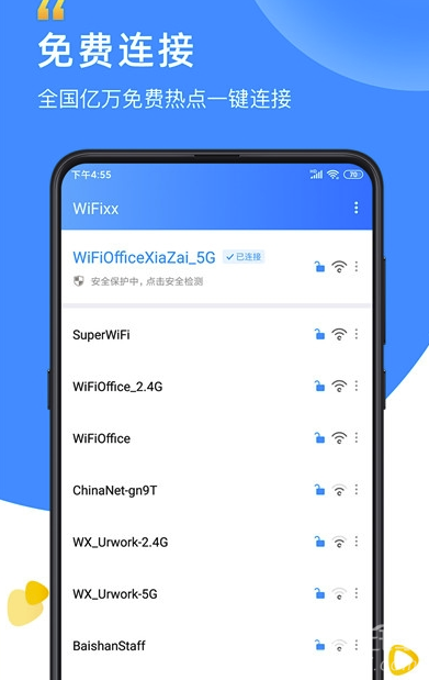 wifixx v2.0.8是一款专为安卓用户设计的wifi信号系统工具,它集成了多种实用功能,旨在为用户提供更安全、更便捷、更高效的无线网络体验。该版本在保持原有强大功能的基础上,进行了多项优化和更新,包括增加热门商圈百万热点,提高连接成功率,并修复了已知bug和用户反馈的问题。wifixx不仅能够帮助用户一键连接免费wifi,还具备防蹭网、wifi测速、信号增强以及保护wifi安全等多重功能,是用户畅游wifi网络的得力助手。