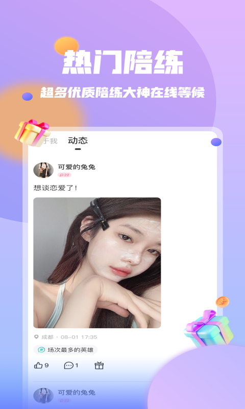 团团电竞安卓版是一款专为电竞爱好者及年轻游戏玩家打造的综合性电竞社交平台。它不仅提供了丰富的游戏陪玩服务,还融合了社交互动、语音聊天、组队开黑等多种功能,旨在为用户打造一个集娱乐、竞技、交友于一体的全方位电竞体验平台。通过强大的gps技术,用户可以轻松找到附近的游戏伙伴,共同享受游戏带来的乐趣。同时,平台上的真人认证系统确保了用户信息的真实性和安全性,让每一位用户都能在一个健康、积极的环境中交流互动。