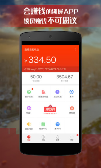3. 丰富的兑换选择:用户获得的收益可以在惠锁屏商城中兑换各种虚拟商品、实物商品或提现到支付宝等,满足用户的不同需求。