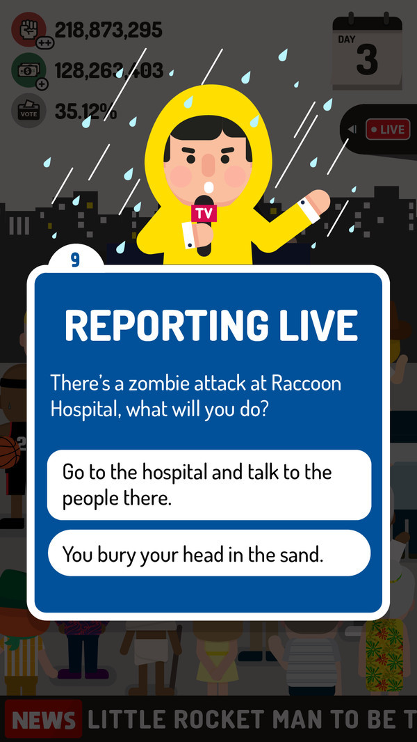 2. 在游戏中,玩家需要与政治家、记者、将军等各界人士进行交谈,提升好感度,从而增加获胜的概率。