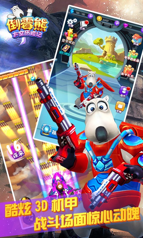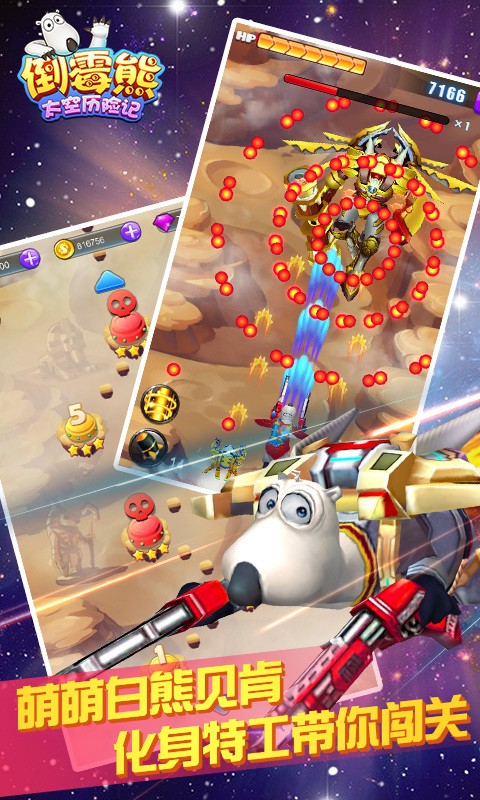 倒霉熊太空历险记是一款改编自韩国热门动画倒霉熊的射击手游,游戏高度还原了动画中的角色形象,并以空战射击为主要玩法。玩家将扮演萌萌哒的白熊贝肯,化身皇家特工,在太空中与外星机甲斗智斗勇。游戏拥有迷人的场景设计、精彩的关卡设置以及炫酷的3d机甲变形功能,为玩家带来了一场惊险刺激的太空冒险之旅。