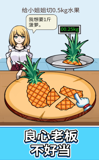 假日切水果是一款极具创意与趣味性的安卓休闲游戏,以其独特的玩法和丰富的游戏内容吸引了大量玩家的喜爱。在游戏中,玩家将扮演一名水果摊老板,需要根据顾客的不同需求,精准地各种食材,确保每份食物都达到指定的重量标准。游戏画面清新明亮,音效轻松愉快,让玩家在享受乐趣的同时,也能感受到经营店铺的成就感。