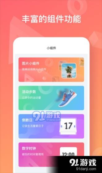 小组件实用:提供了图片小组件、运动步数、倒数日、数字时钟等多种小组件,方便用户进行桌面管理。3.