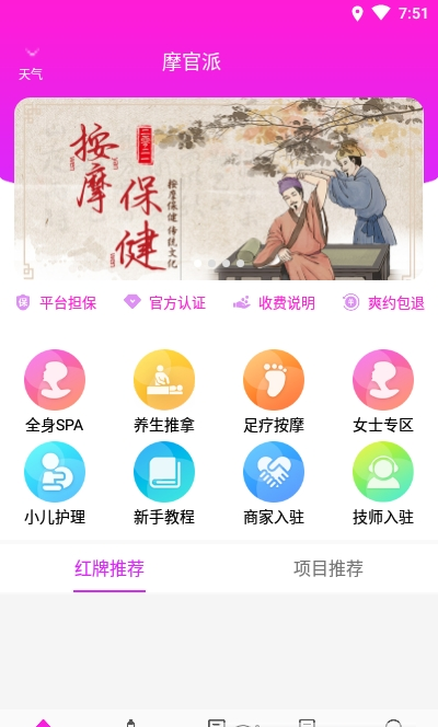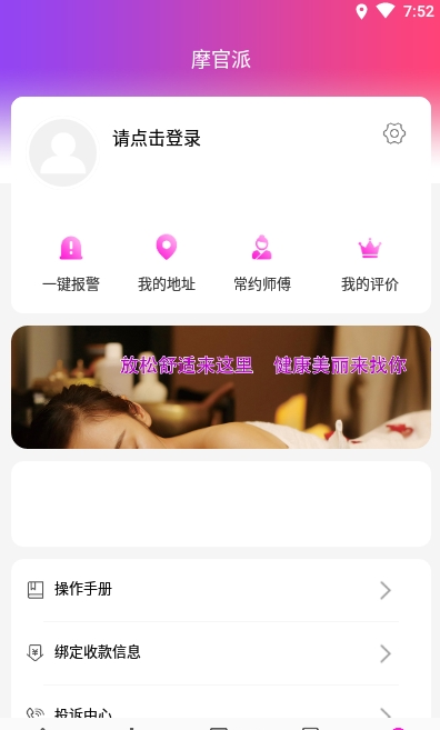 摩官派是一款专为追求健康生活的用户设计的安卓应用,它集成了中医推拿、按摩、spa、足疗等多种养生服务,旨在通过便捷的上门服务方式,让用户在家中即可享受到专业、安全、高效的按摩体验。作为中国领先的o2o专业按摩服务平台,摩官派不仅汇聚了国内一流的专业按摩技师团队,还通过自主研发的智能预约系统,为用户提供了从线上预约到线下服务的全方位解决方案。