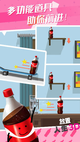 放置人生是一款由北京掌信创游科技有限公司精心打造的休闲益智类安卓手机游戏。在这款游戏中,玩家将扮演一个瓶子(或是一瓶可乐),在充满趣味的房间内展开一场别开生面的冒险之旅。游戏通过简洁而有趣的画风,搭配精心设计的物理机制,让玩家在跳跃与翻滚中享受独特的游戏体验。玩家需要利用房间内的各种道具,如桌子、沙发等,进行跳跃和移动,避免落地,最终到达终点。游戏不仅考验玩家的手速与眼力,还融入了丰富的关卡设计和多样的挑战模式,为玩家带来无尽的乐趣与成就感。