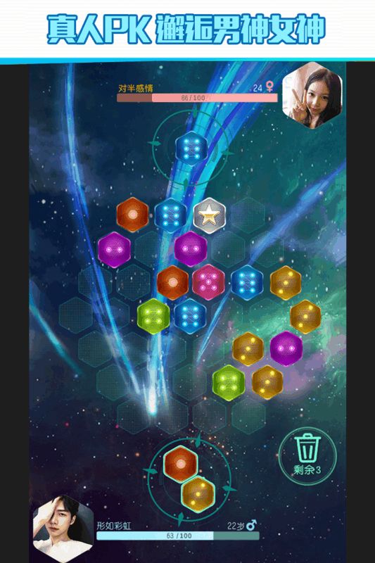 快手六角拼拼是一款充满趣味和挑战的安卓休闲益智手游。在这款游戏中,玩家需要将不同颜色的连体六角形拼图碎片放置在棋盘上的空白处,通过策略性地布局和消除,来获得高分并战胜对手。游戏界面清新独特,采用卡通风格设计,让玩家在轻松愉快的氛围中享受拼图带来的乐趣。