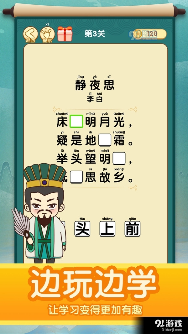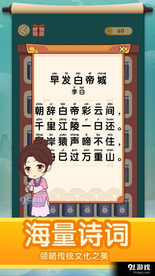 2. 游戏中包含了大量的古诗词题目,涵盖了唐诗宋词等多个朝代和风格的诗词。