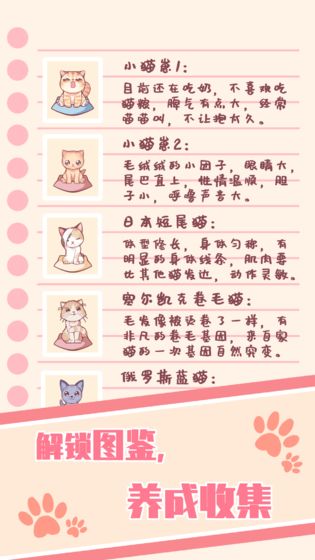 3. 合成新猫:游戏中,玩家可以将相同品种的猫咪进行合成,有机会解锁新的猫咪种类,增加游戏的趣味性和挑战性。