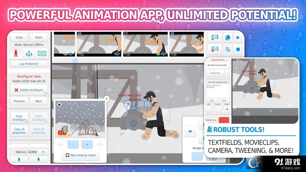 2. 添加素材与关键帧:在动画编辑界面中,用户可以自由添加火柴人形象、背景素材以及关键帧,通过调整关键帧的位置和属性来定义动画的运动轨迹。