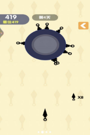 1. 玩家需要通过点击屏幕发射飞镖(即插针),插中上方的球体或目标物体。