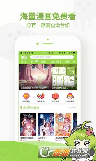 2. 界面友好:软件界面设计简洁清晰,操作便捷,用户可以通过搜索、分类、排行榜等多种方式快速找到想看的漫画。