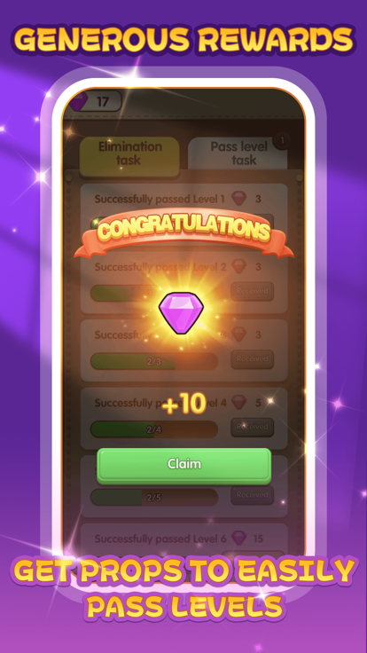 3. 独特的奖励机制:完成消除任务即可获得装备奖励和道具奖励,助力玩家轻松闯关。