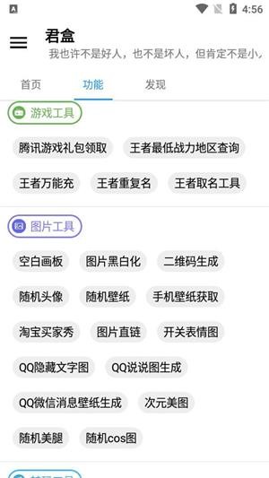 君盒是一款功能强大的安卓软件,它集日常工具、图形工具、转码工具、qq工具、游戏工具等多种实用功能于一体,为用户提供了一站式的解决方案。无论是生活还是工作,君盒都能帮助你轻松应对各种问题,提升效率。