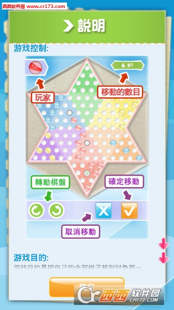 1. 棋子移动:棋子的移动可以一步步在有直线连接的相邻六个方向进行,如果相邻位置上有任何方的棋子,且该位置直线方向下一个位置是空的,则可以直接“跳”到该空位上。