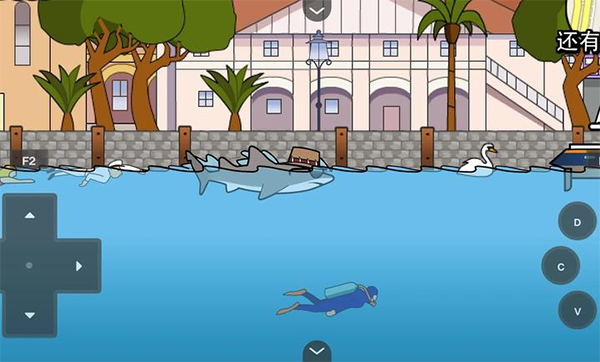 1. 基础操控:进入游戏后,通过虚拟摇杆控制鲨鱼游动,点击攻击键撕咬目标。长按↓键潜入水底,快速上浮可实现高空跳跃,用于突袭飞行物。