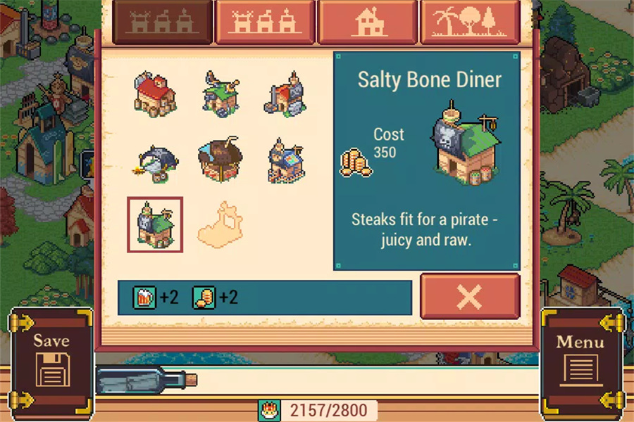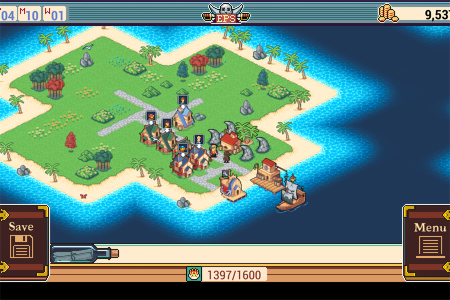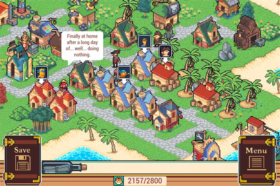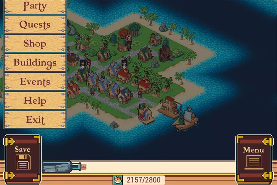 3. 角色成长:船员拥有耐力、敏捷、幸运等属性,通过完成任务、访问建筑(如防具店提升耐力+1、敏捷+0)或举办节日活动(消耗金币永久提升属性)实现成长。关键任务(绿色Q图标)可解锁新建筑与船只升级,提升载员量与小岛繁荣度。