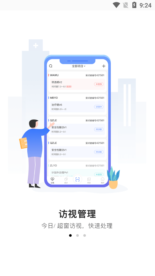 2. 高效的访视管理:提供近日/超窗访视快速处理功能,扫码签到现场打卡,数据同步更新,让访视管理更加便捷高效。