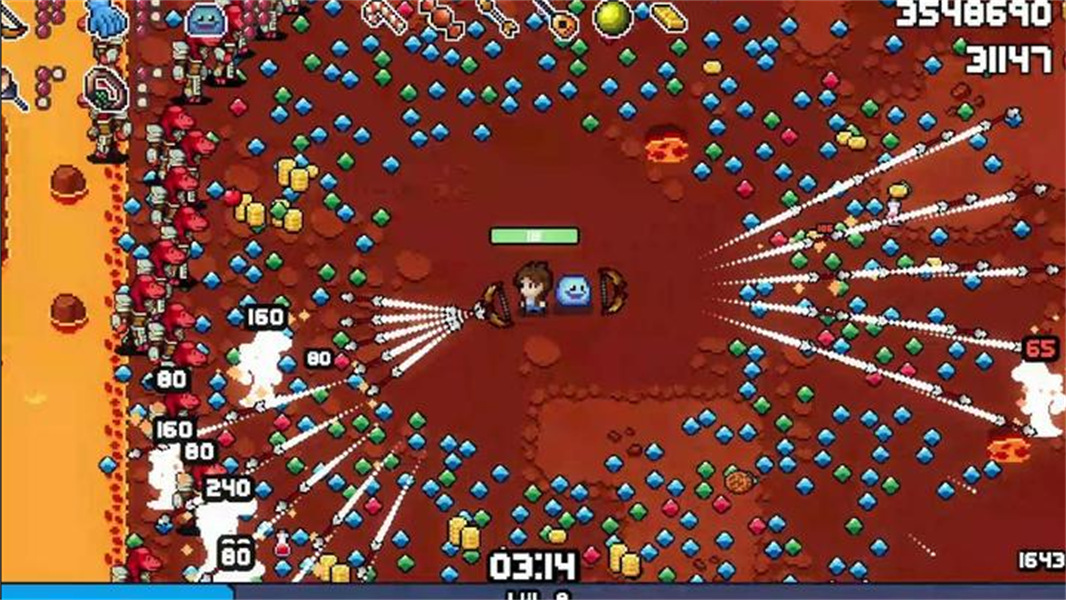 1. 像素美学与动态特效:采用经典像素画风,角色与怪物设计充满萌趣,战斗中密集的弹幕与技能特效形成视觉冲击,例如史莱姆伙伴释放的追踪弹幕与护盾技能,营造出割草式清屏的爽快感。