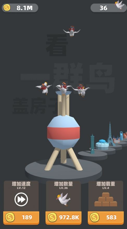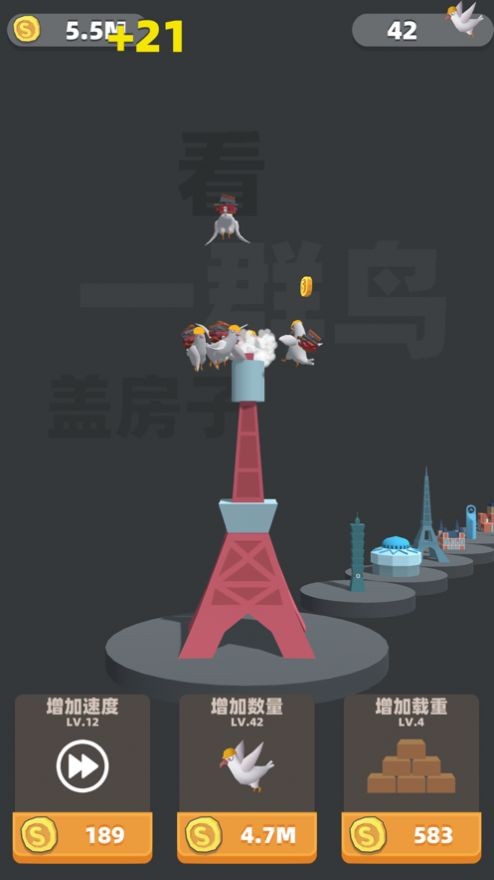 1. 放置挂机玩法:游戏采用放置挂机模式,玩家无需持续操作,小鸟会自动进行建造,解放双手。