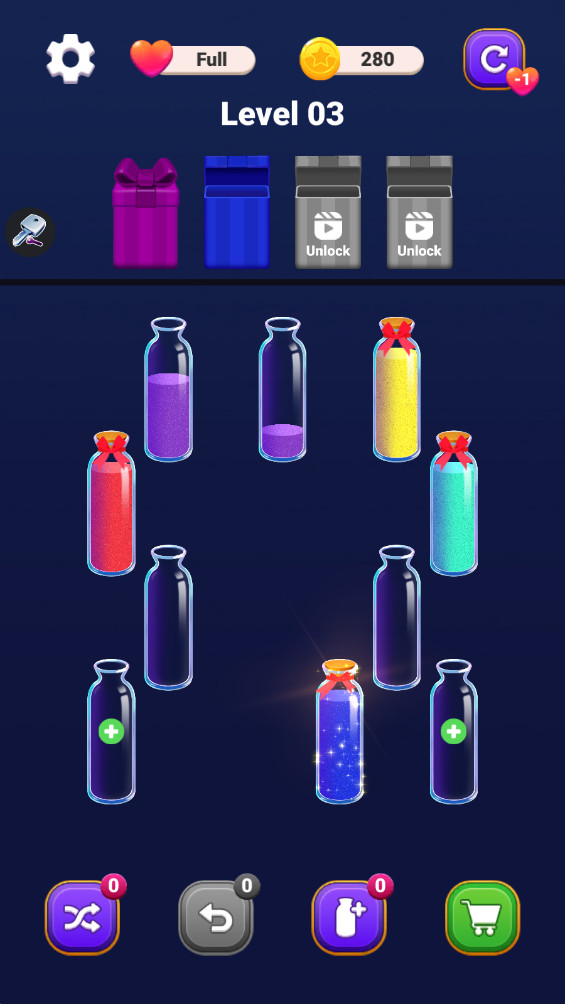 3. 利用道具突破瓶颈:游戏提供“重置沙层”“扩容容器”等道具,可在卡关时使用。例如,当沙层因操作失误混合时,使用重置道具可恢复初始状态;当目标容器容量不足时,扩容道具可增加1-2次倒沙机会。