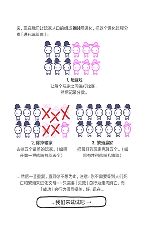 信任的进化是一款由新加坡独立游戏开发者nicky case制作,并由火树游戏于2017年移植到移动端的休闲游戏。该游戏以合作博弈论为主题,通过互动的方式深入浅出地解释了社会选择与变迁的社科理论。游戏改编自罗伯特·阿克塞尔罗德的经典著作合作的进化,旨在通过游戏化的方式让玩家理解信任的成本与意义。游戏包含10个关卡,角色多样,如复读机、千年老油条、万年小粉红等,每个角色都有其独特的策略和行为模式。