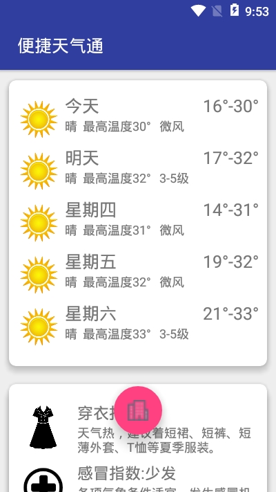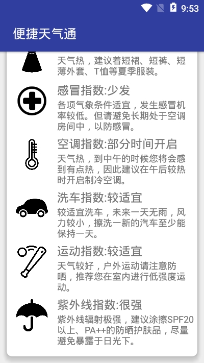 4. 生活指数:提供穿衣、洗车、运动等生活指数建议,帮助用户更好地安排日常生活。