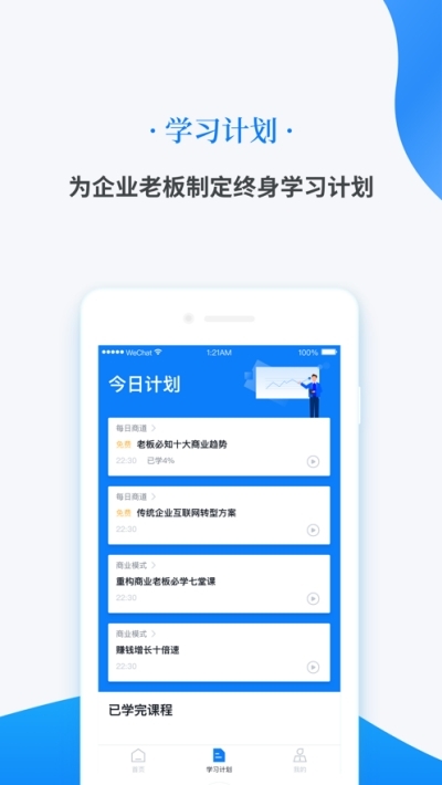 2. 学习计划自由定制:软件支持用户添加学习计划,每天需要学习的课程可以随时添加,完成的学习任务也会在线显示。