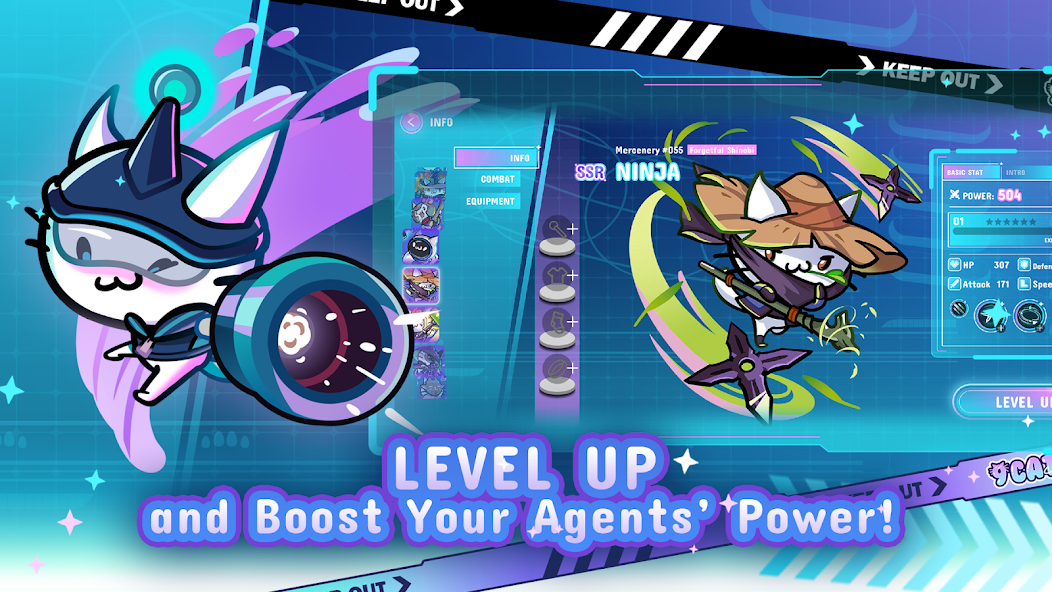 2. 角色养成体系:每只猫咪拥有三条进化分支,通过收集特定材料可解锁不同形态。例如"机械猫"可进化为重装坦克或高速刺客,装备镶嵌系统支持自定义属性加成,配合套装效果(如"暗夜套装"提升夜间作战能力)实现个性化培养。