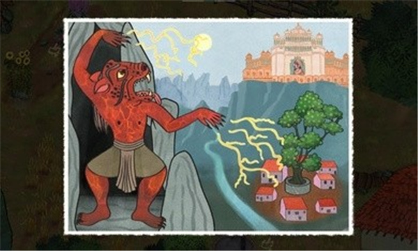 3. 视觉与听觉双重享受:手绘水彩风格搭配动态光影效果,使山丘、森林与宫殿呈现层次分明的色彩变化。背景音乐采用印度传统乐器如西塔琴与塔布拉鼓,营造出悠扬的异域氛围。