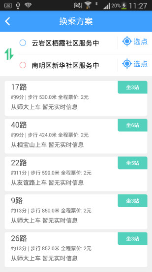 2. 换乘规划:输入起点和终点后,软件会自动推荐最佳的出行方案,包括步行距离、换乘信息和公交车到达时间。