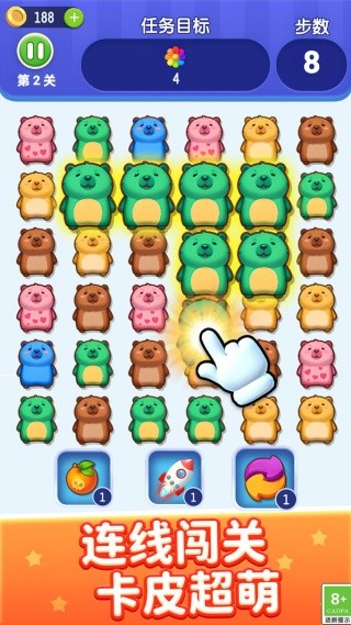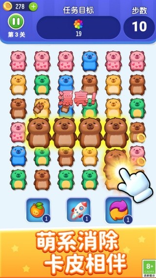 1. 萌宠主题:游戏以卡皮巴拉为核心形象,设计了多种不同肤色、表情的呆萌宠物,让玩家在消除过程中感受到满满的治愈感。