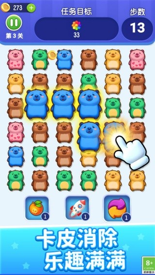 2. 画面精美:采用清新明亮的卡通画风,卡皮巴拉造型呆萌讨喜,消除特效生动活泼,为玩家营造出轻松愉悦的游戏氛围。