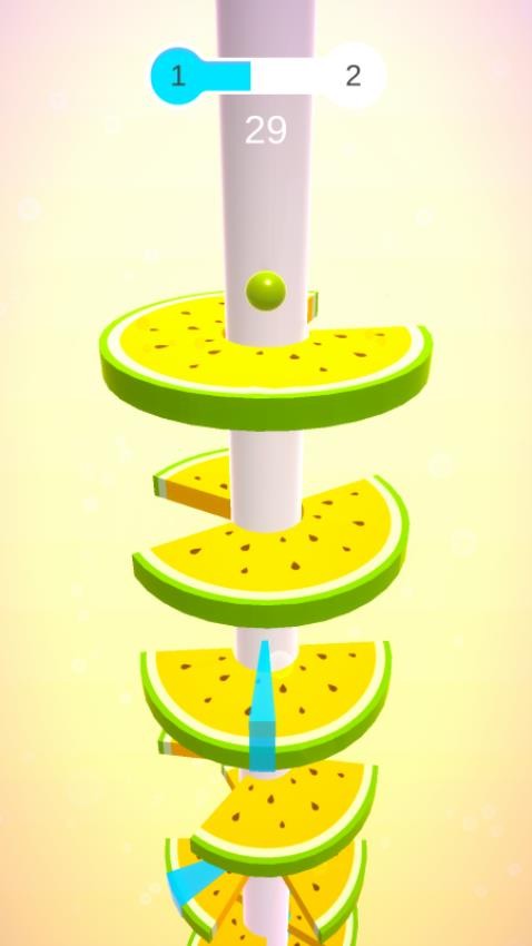 1. 核心玩法:玩家通过单指滑动屏幕控制螺旋塔旋转,引导小球从顶层下落,需精准落在无障碍物的水果方块(如草莓、西瓜、柠檬等)上,连续越过多个方块可形成combo累积额外分数。