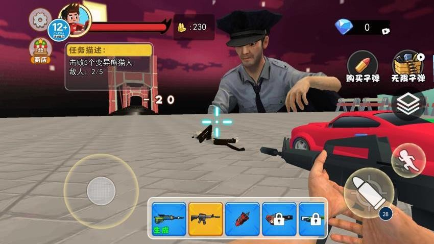 1. 武器生成与使用:玩家可通过变异枪生成变异熊猫人、变异大象等生物协助作战,或直接使用火箭筒、加特林机枪等武器射击敌人,子弹消耗可通过商店购买或解锁无限子弹模式补充。