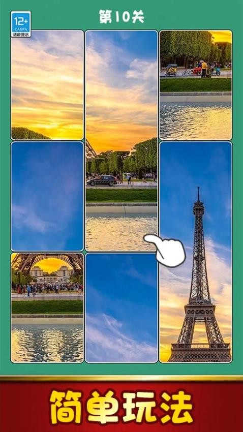 1. 碎片操作:玩家通过长按并拖动屏幕移动碎片,支持自由旋转与方向调整,例如在拼接巴黎铁塔时,需将底部基座碎片旋转至正确角度后滑动至画面中央。