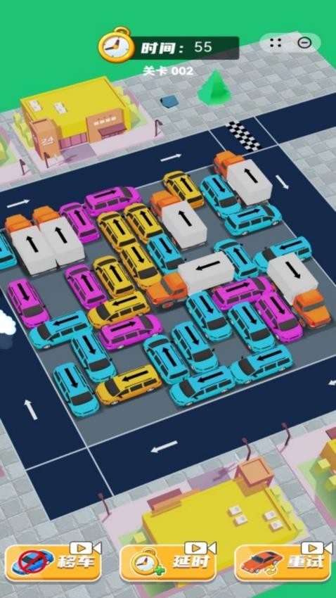 1. 固定布局:每关车辆初始位置固定,支持反复挑战优化解法。