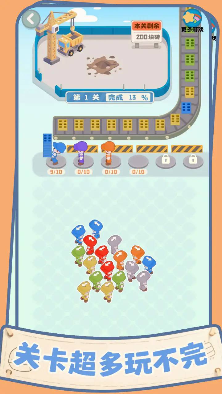 1. 基础建造流程:玩家需先查看关卡目标砖块数量与颜色分布,例如某关卡需200块红色砖块与150块蓝色砖块,随后分配对应颜色工人至传送带起点。