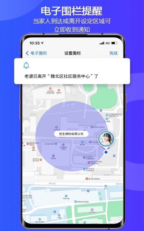 3. 电子围栏:设置指定区域,当家人离开或到达该区域时,用户会收到及时通知。
