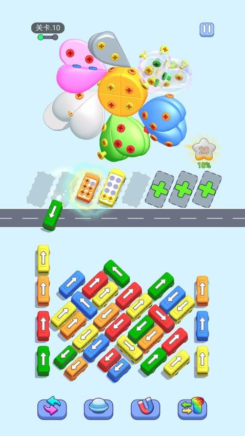 2. 车辆模型多样化:提供多种颜色与造型的车辆模型,包括大型巴士、小型轿车等,大型车辆每次可装载8个螺钉,增加策略选择维度。