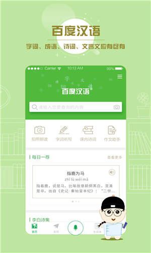 百度汉语是一款专为android用户设计的汉语学习工具,由百度在线网络技术(北京)有限公司开发。该应用以弘扬中华文化、推广汉语学习为宗旨,致力于提供智能、权威、便捷的汉语学习服务。百度汉语不仅收录了超过三十多万条词汇,覆盖k12学习常见字、生僻字、词语、成语及网络词汇,还通过问答检索、语音、拍照、部首笔画等多种查询方式,满足不同用户的学习需求。此外,应用内还设有谜语、成语接龙、古诗词挑战等益智游戏,增强学习的趣味性和互动性。