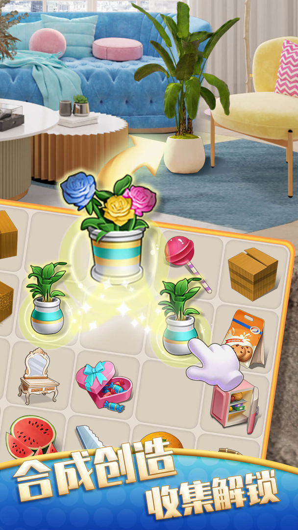 甜点消消趣味家装是一款玩法简单、画风清新的家装消除休闲游戏。在游戏中,玩家将扮演设计师凯洛琳,通过拖拽合并相同元素来收集装修材料,帮助好友装修房子。游戏融合了消除与家装创意,让玩家既能享受消除的乐趣,又能体验家居设计的成就感。画面采用3d卡通风格,甜点和家具设计得可爱又精致,背景音乐轻快治愈,特别适合在碎片时间放松心情。