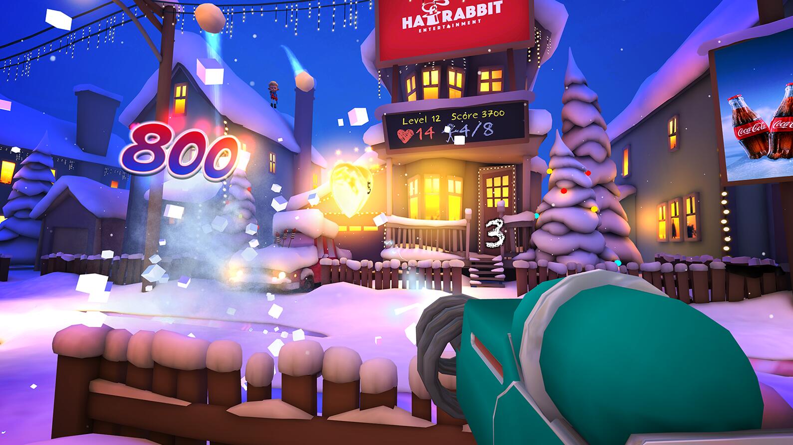 2、玩家扮演小孩儿在自家门前向路过或别家门前的孩子儿扔雪球,砸到即可得分;