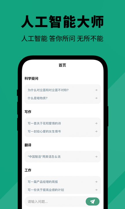 人工智能大师是一款专为安卓用户设计的智能ai聊天软件,它通过先进的ai技术为用户提供高效、便捷的交流体验。这款软件不仅能够回答用户的各种问题,还具备写作、学习、娱乐等多种功能,满足用户在不同场景下的需求。人工智能大师以其强大的智能分析能力和友好的交互界面,成为了用户日常生活中不可或缺的虚拟助手。